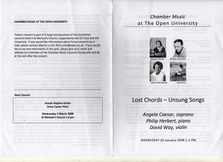 A specially created recital of Art songs, Chamber music for violin and piano, plus piano solos by composers from the Harlem Renaissance: including William Grant Still, Margaret Bonds, Florence Price, Undine Smith Moore, Hall Johnson, Betty Jackson- King and others. This project was selected for the national Decibel Showcase hosted by the Arts Council of England at the CBSO Centre, touring across the country to finish in the Purcell Room at the Southbank Centre, London. Also performed this recital in the Open University Concert series.