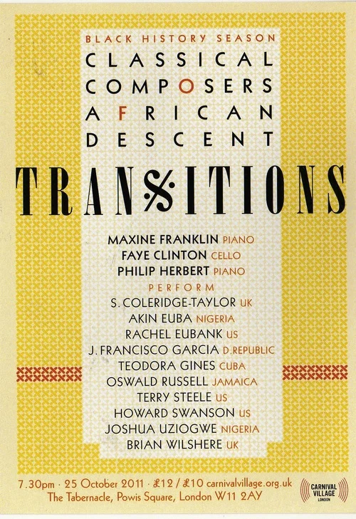 Transitions, featuring music of classical composers of African descent. Music from the African Diaspora. Recital with Maxine Franklin (Piano), Faye Clinton (Cello) and Philip Herbert (Piano).