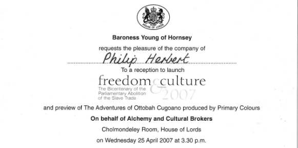 Commissioned by Baroness Lola Young to write a piece for the International Freedom and Culture Conference at the South Bank Centre, entitled 'Oh Freedom' from the Negro Spiritual, it was performed by the Philharmonia Orchestra. Philip was also invited to attend the reception to the conference at the House of Lords.
